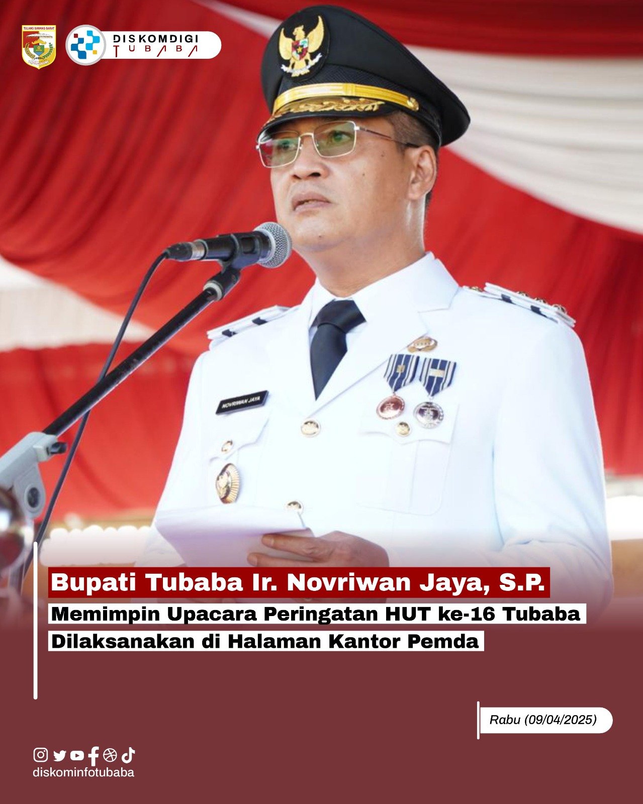 kominfo Tubaba, Media Mata Lensa.id – Bupati Tulangbawang Barat (Tubaba) Ir. Novriwan Jaya, S.P., memimpin upacara peringatan HUT ke-16 Tubaba yang dilaksanakan di Halaman Kantor Pemda setempat pada Rabu (09/04/2025).