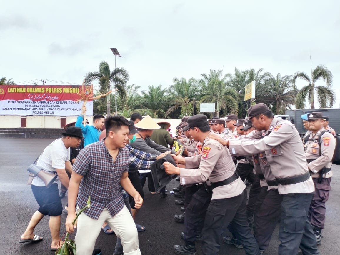 “Polres Mesuji hari ini melaksanakan Latihan peningkatan kemampuan dalam rangka mensiapsiagakan anggota apabila menghadapi dalam suatu kondisi aksi masa unjuk rasa ataupun aksi aksi anarkis lainnya yang mungkin terjadi di Wilayah Hukum Kabupaten Mesuji”. Jelas Kapolres Mesuji AKBP Muhammad Harris S.H, S.Ik, M.Ik, CPHR