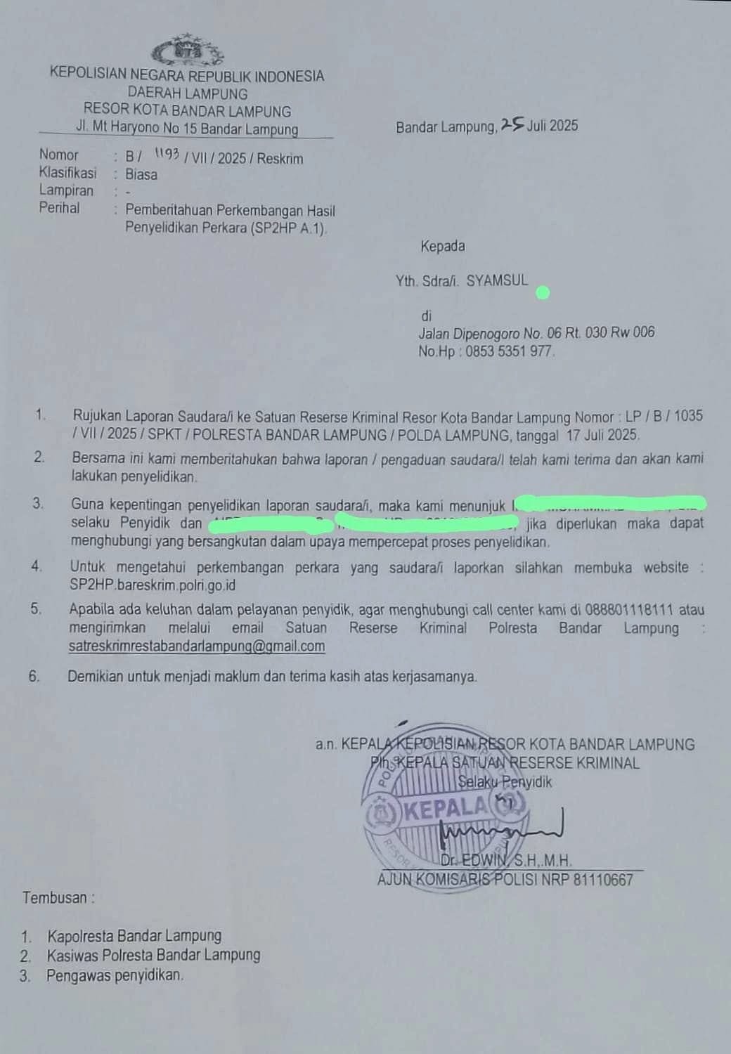 Kuasa hukum SA Fajar Arifin, S.H membenarkan terkait penyelidikan didasari adanya Surat Pemberitahuan Perkembangan Hasil Penyelidikan Perkara (SP2HP) dengan Nomor : B / 1193 / VII / 2025 / Reskrim, tertanggal 25 Juli 2025 yang ditanda tangani Plh. Kasat Reskrim AKP. Dr. Edwin S.H,.M.H.