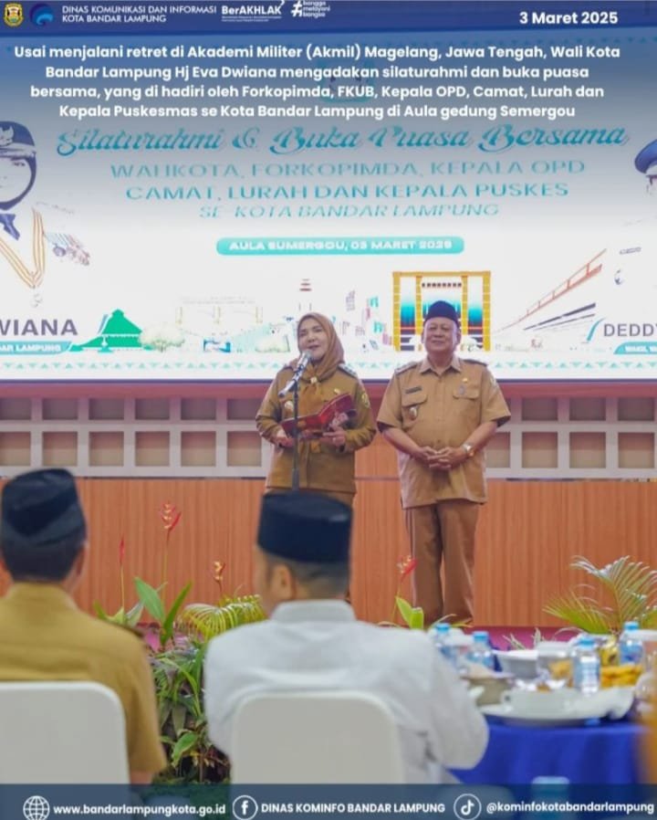 Bandar Lampung, Media Mata Lensa.id – Usai menjalani Retreat di Akademi Militer (Akmil) Magelang, Jawa Tengah, Wali Kota Bandar Lampung Hj. Eva Dwiana mengadakan silaturahmi dan buka puasa bersama, yang di hadiri oleh Forkopimda, FKUB, Kepala OPD, Camat, Lurah dan Kepala Puskesmas Se-Kota Bandar Lampung di Aula gedung Semergou. Pada hari Senin, (03/03/2025).